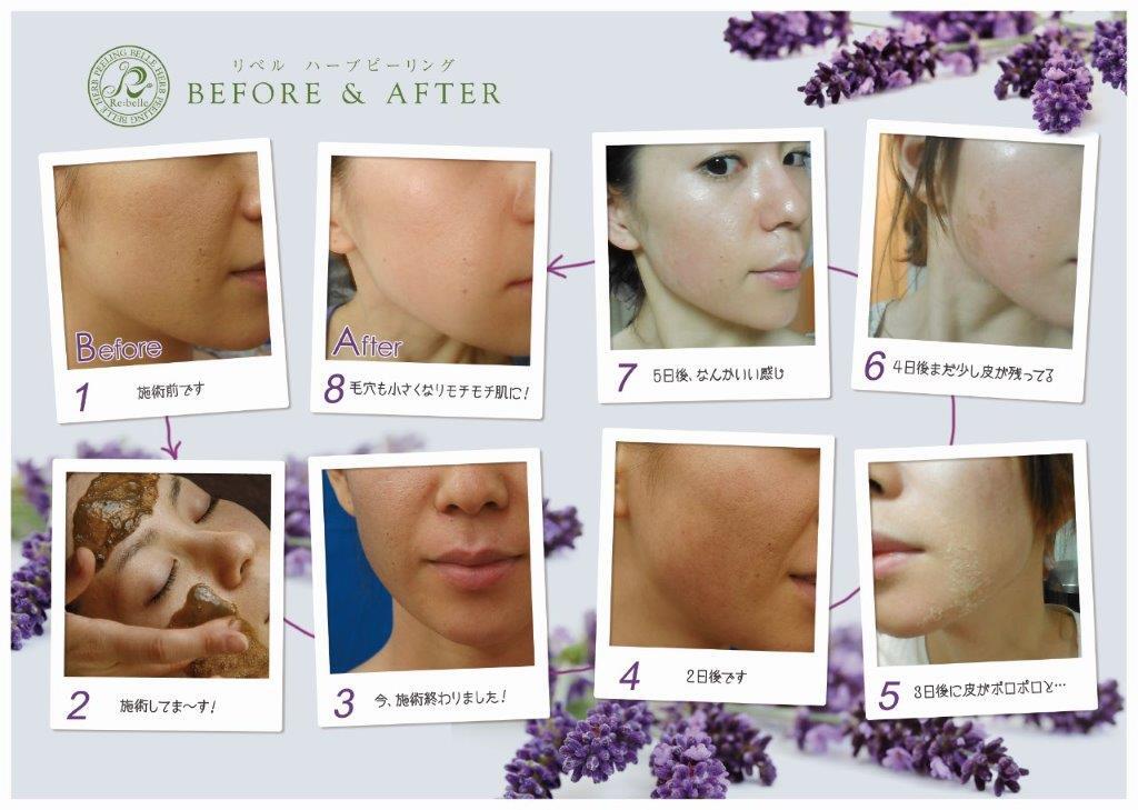 リベルハーブピーリングは従来のピーリングとは違い、棘状成分を浸透させ成長因子を深部まで導入することにより、肌のターンオーバーを通常28日周期を3〜5日という短期間で、肌再生、自然剥離を行います。