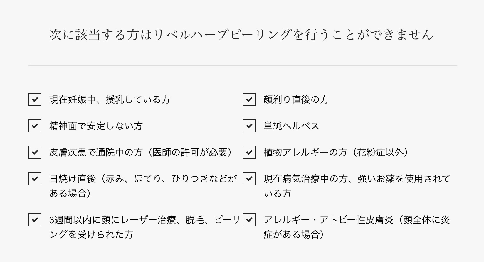 リベルハーブピーリングは、安全性の高いトリートメントですが、より安全に受けていただくために、下記の注意事項を必ずお読み下さい。